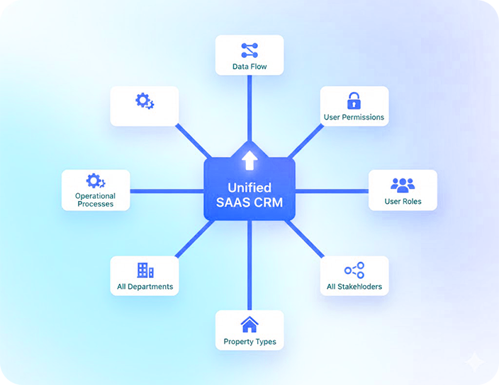 SAAS CRM ensures consistent data flow, permissions, and processes across departments, property types, and user roles.